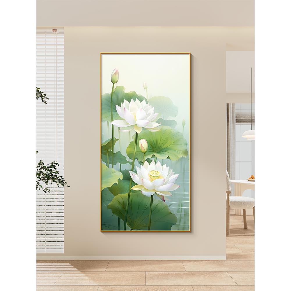 新中式荷花玄关装饰画进门入户竖版挂画晶瓷画走廊过道墙画壁网红