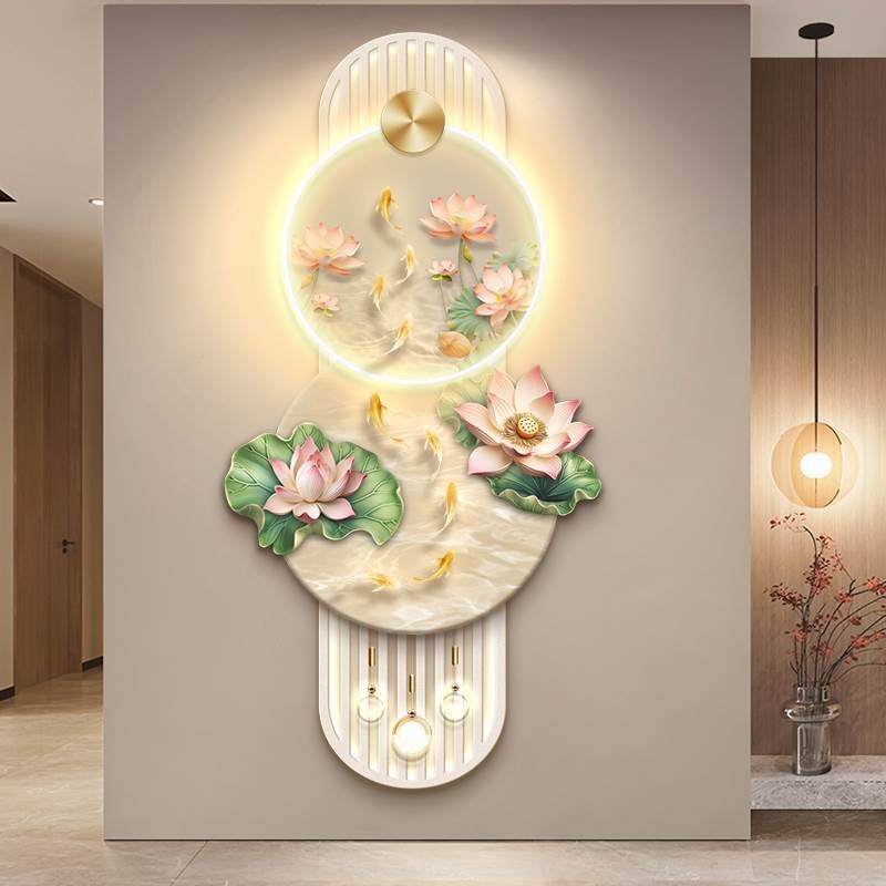 现代轻奢荷花玄关装饰画入户门九鱼图led灯画走廊尽头高级感挂画