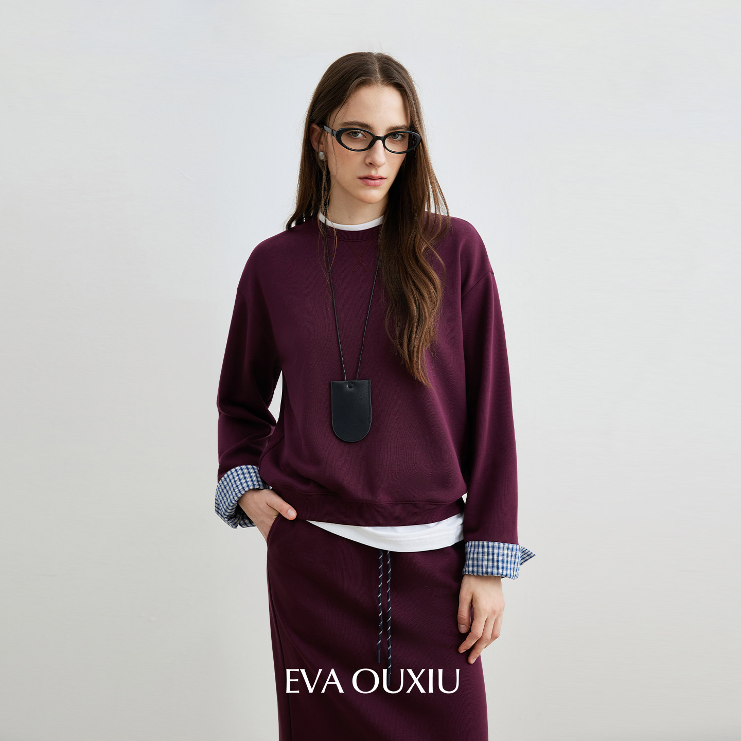 EVAOUXIU【新品】简约休闲棉撞色圆领舒适宽松卫衣抽绳半身裙套装