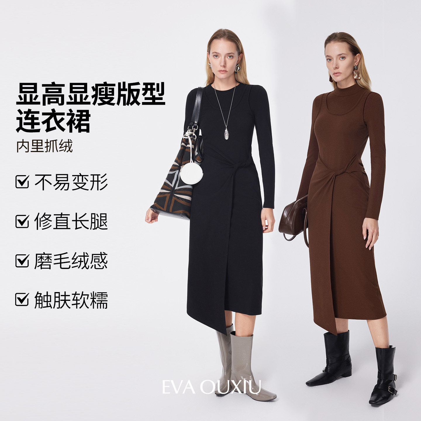 EVAOUXIU商场同款秋冬褶皱收腰显瘦设计气质通勤抓绒针织连衣裙