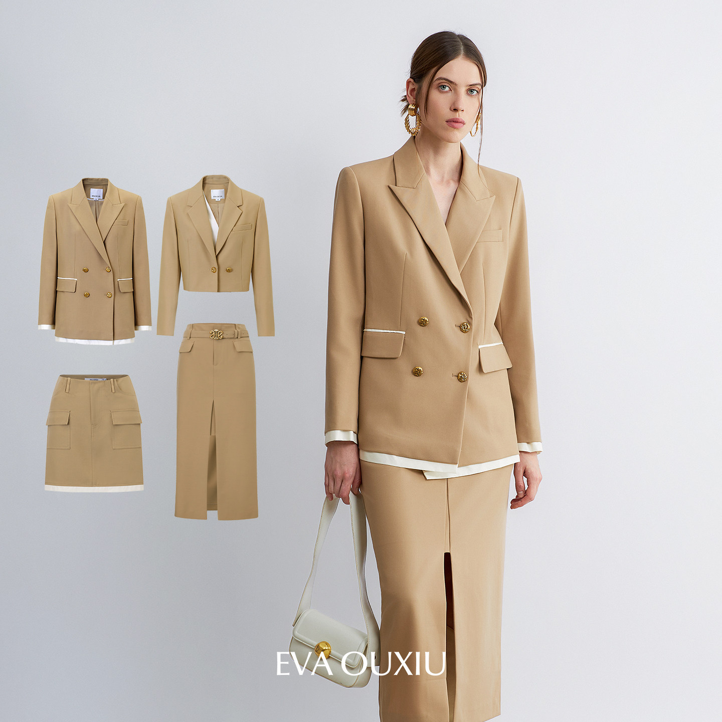 EVAOUXIU职场通勤西装外套+半裙高级感莱赛尔醋纤时尚西服套装新