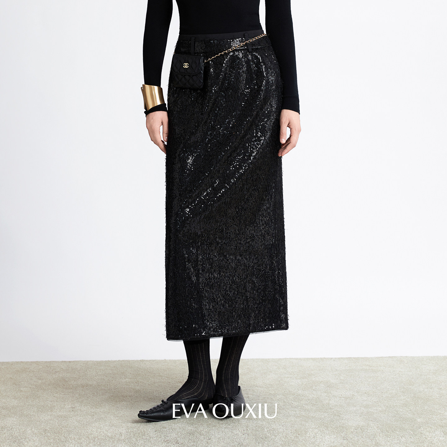 EVAOUXIU奢雅重工亮片优雅半身裙25秋季新款时尚别致黑色直筒长裙