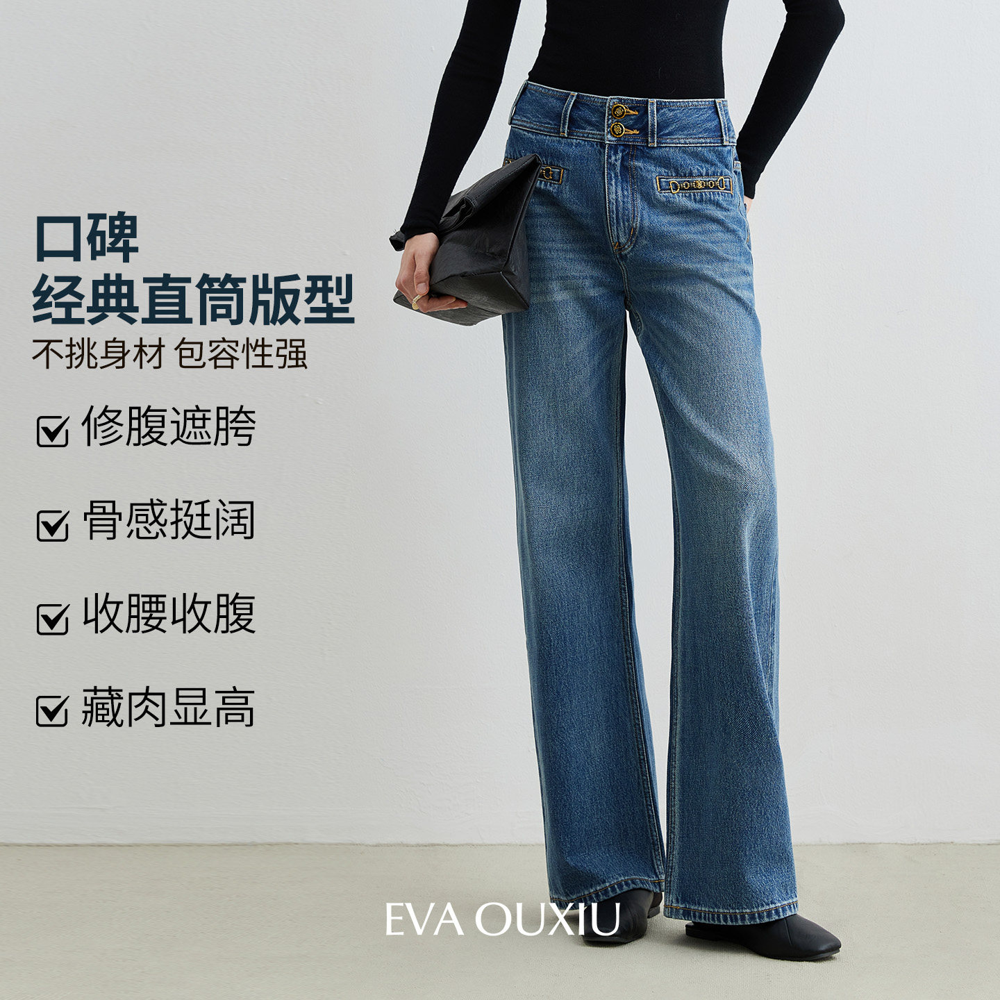 EVAOUXIU新显瘦高腰直筒牛仔裤女纯棉复古水洗设计感休闲长裤女