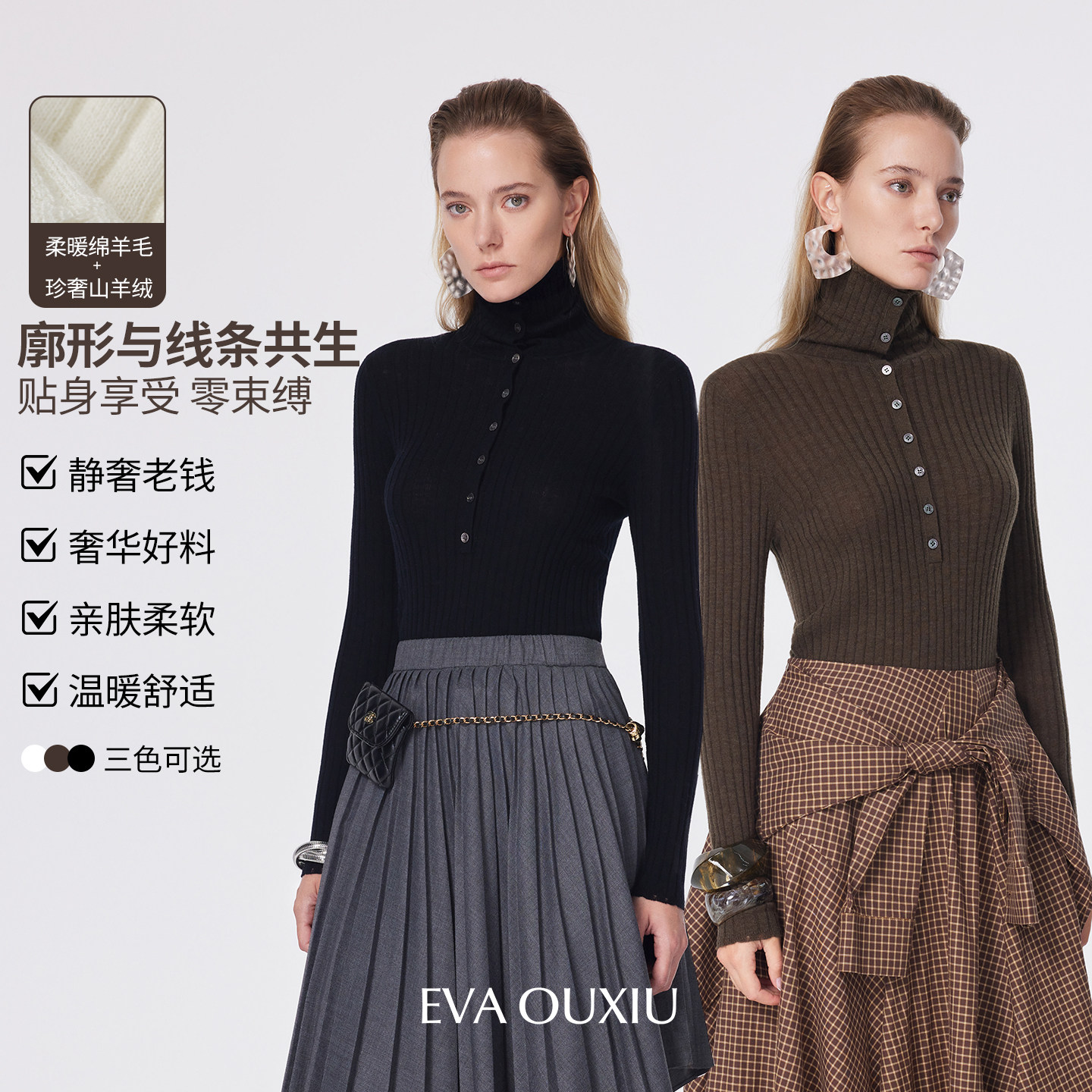 EVAOUXIU商场同款解构设计纽扣高领羊绒羊毛坑条亲肤显瘦针织套衫