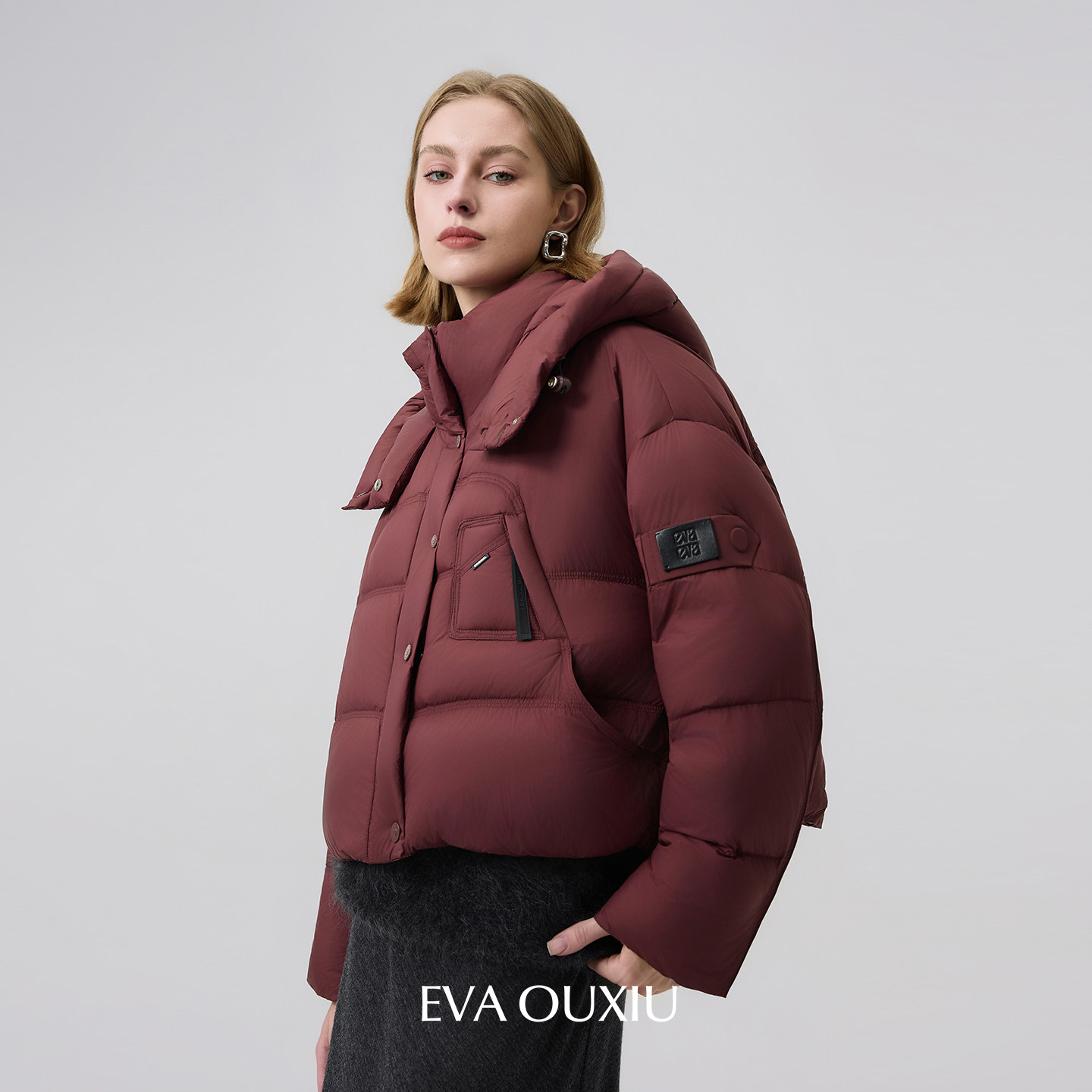 EVAOUXIU【新品】连帽鸭绒服加厚保暖外套廓形短款简约泡芙羽绒服