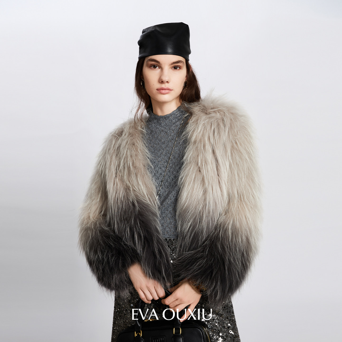 EVAOUXIU重磅晕染渐变V领短款貉子毛奢雅皮草外套女秋冬毛毛大衣