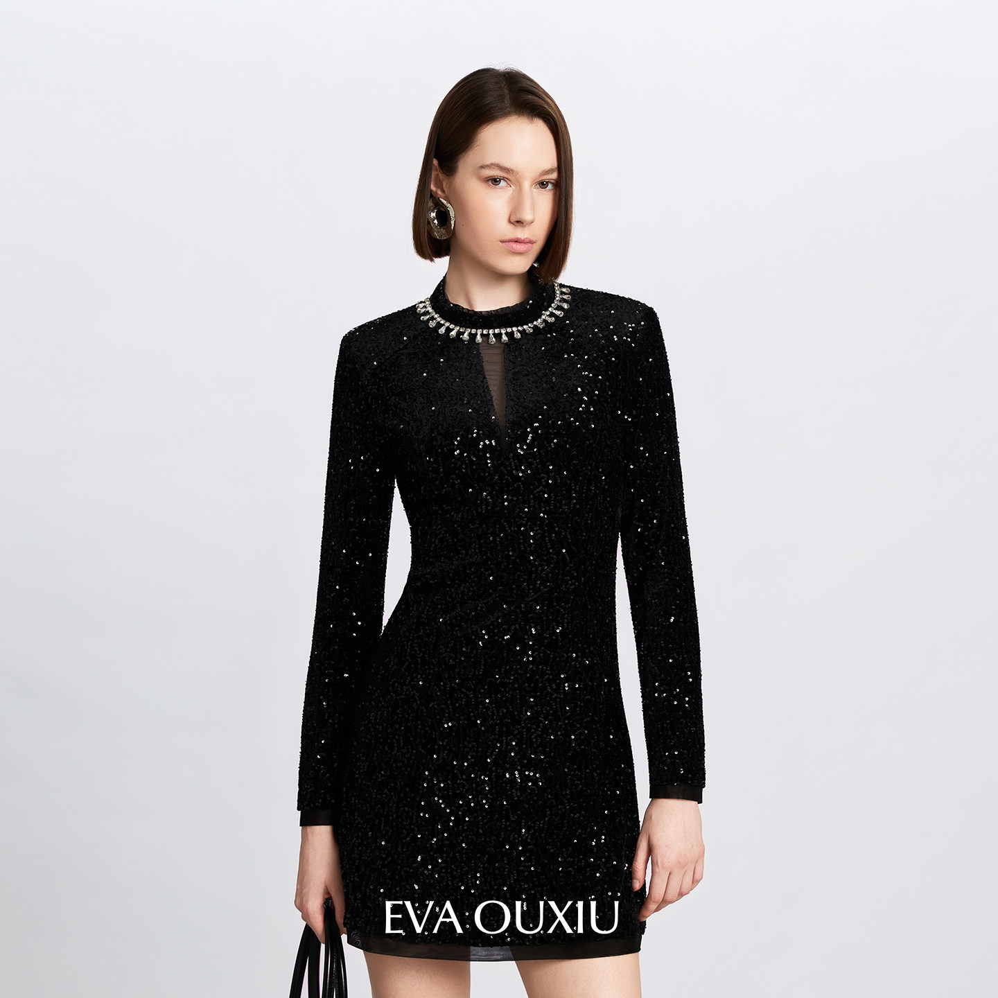 EVAOUXIU重磅钉珠领亮片丝绒A字黑色连衣裙长裙气质流行显瘦穿搭