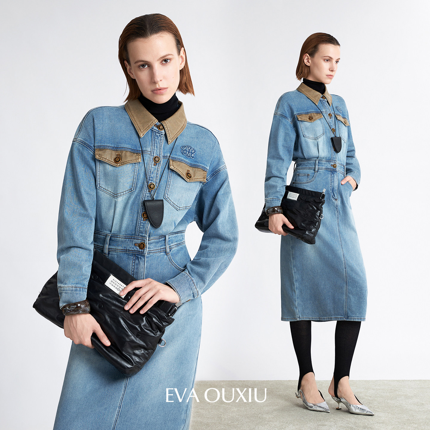 EVAOUXIU时髦拼接撞色牛仔棉连衣裙巴恩风流行显瘦穿搭秋冬直筒裙