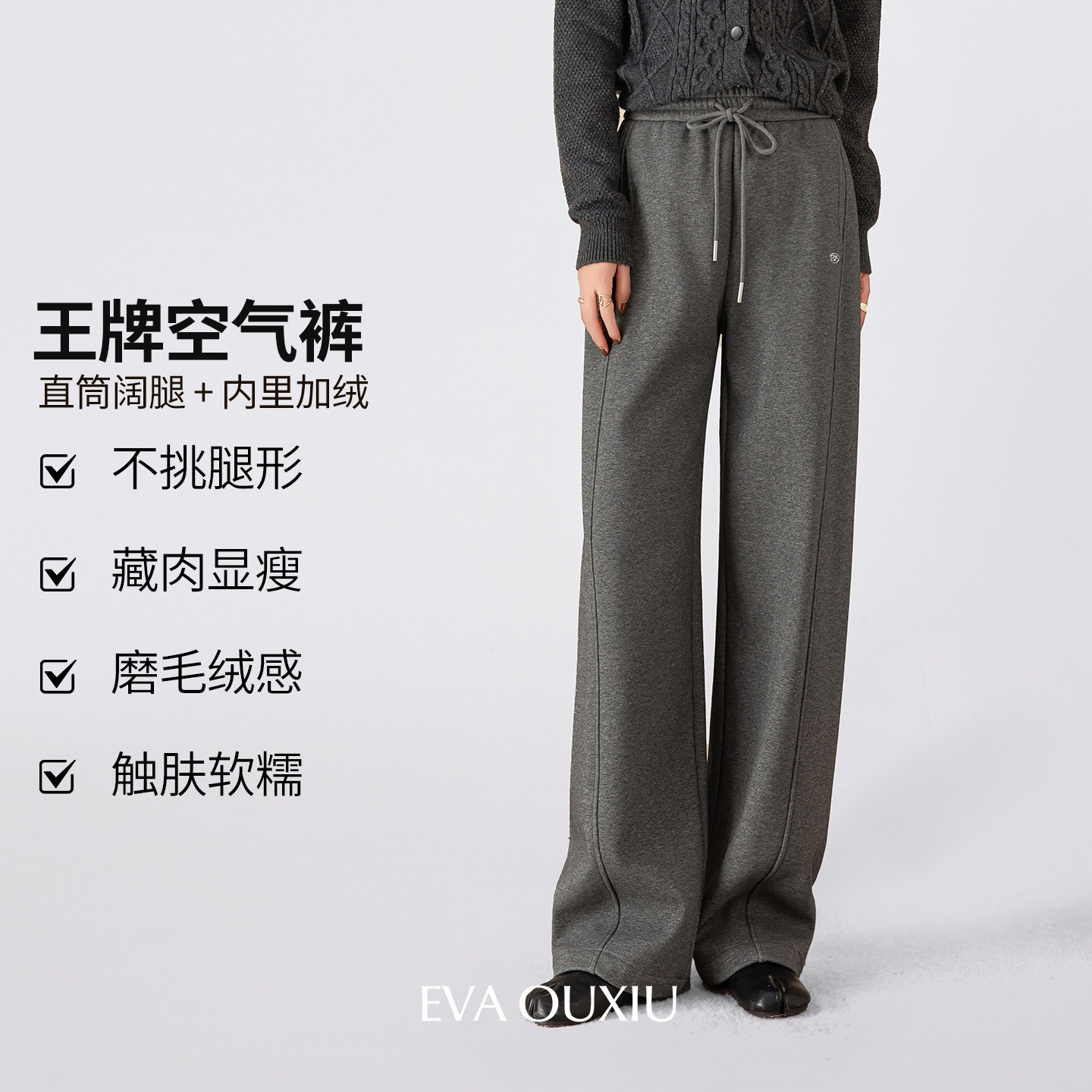 EVAOUXIU【新品】一条过冬垂感抽绳橡筋腰加绒直筒阔腿灰色空气裤