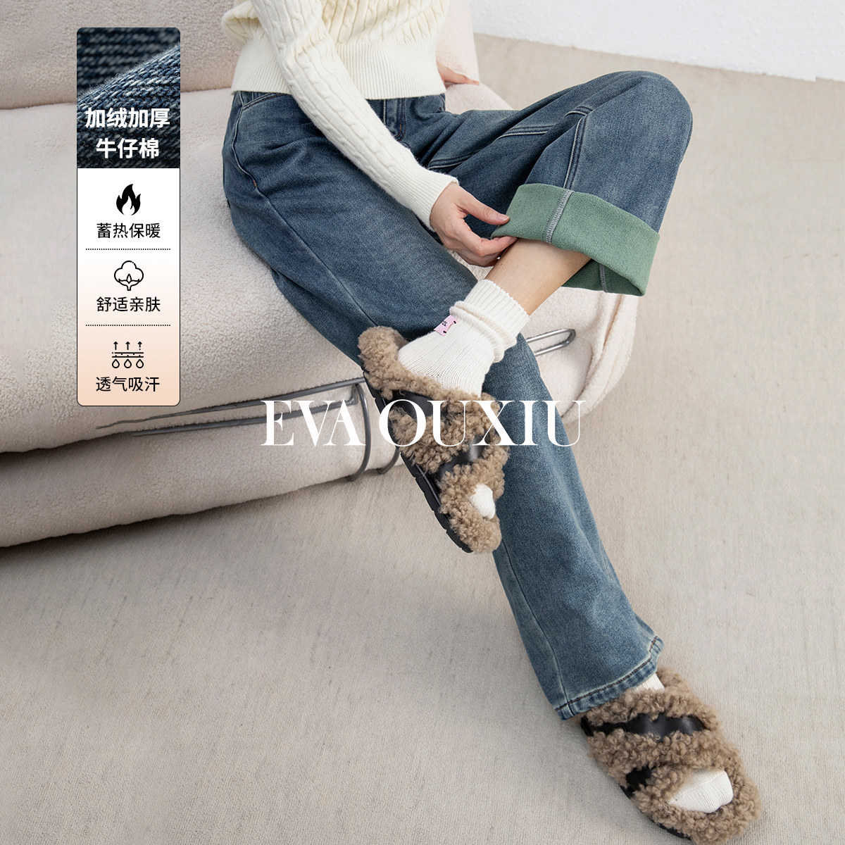 EVAOUXIU宽松直筒牛仔裤显瘦复古高腰加绒加厚长裤子2025春季新款