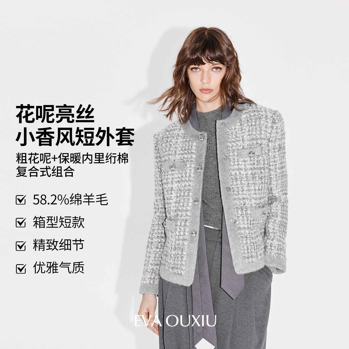EVAOUXIU静奢粗花呢绵羊毛毛呢大衣亮片小香风夹棉轻厚短外套女冬