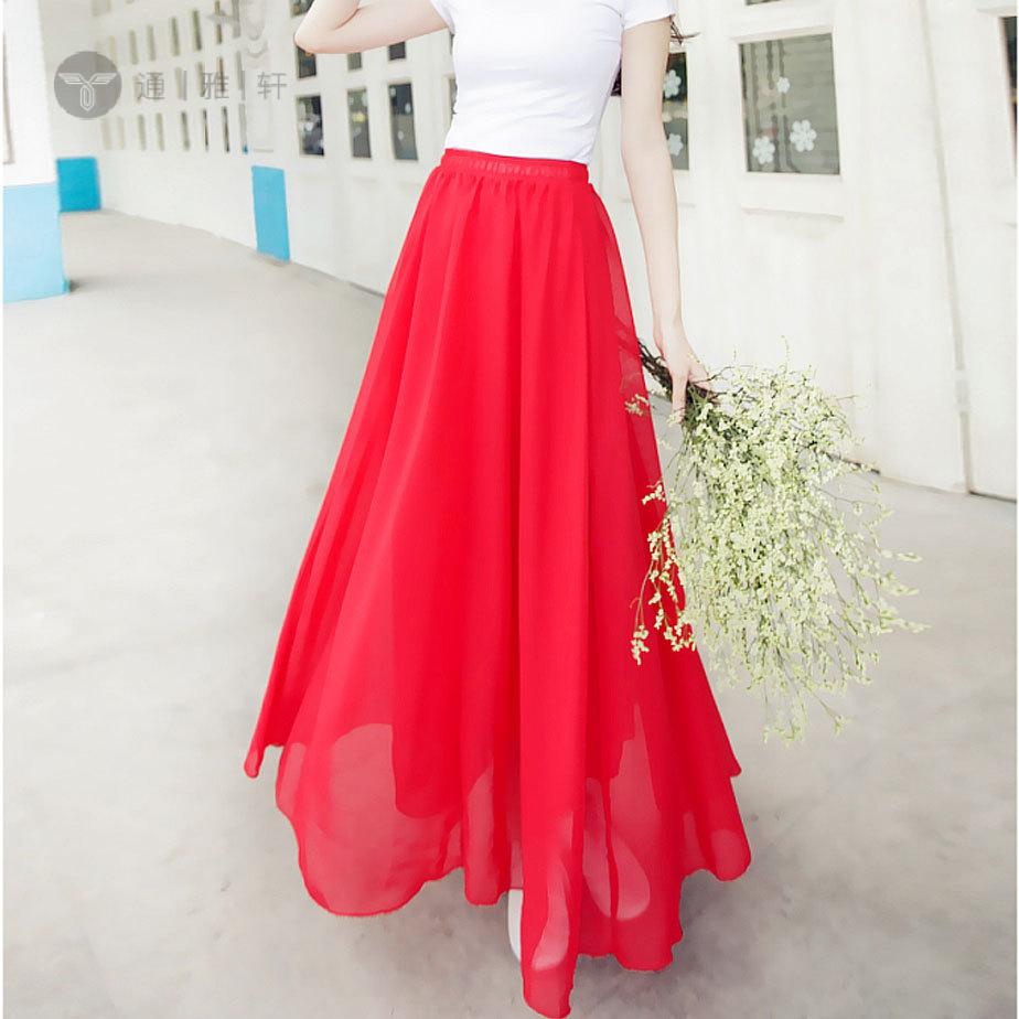 高腰显瘦半身长裙夏女雪纺波西米亚仙女裙子纯色半身裙沙滩中长款