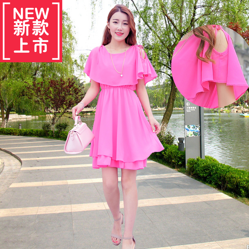 春夏新款女连衣裙纯色中长显瘦荷叶短袖宽松休闲大摆雪纺沙滩女裙