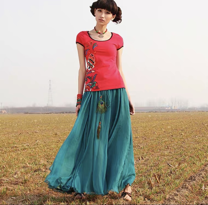 大摆长裙雪纺半身裙女夏沙滩舞裙垂感纯色A字中长款波西米亚纱裙