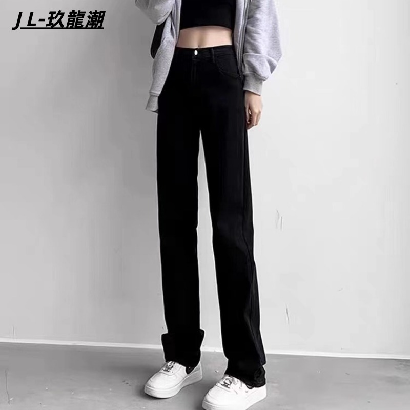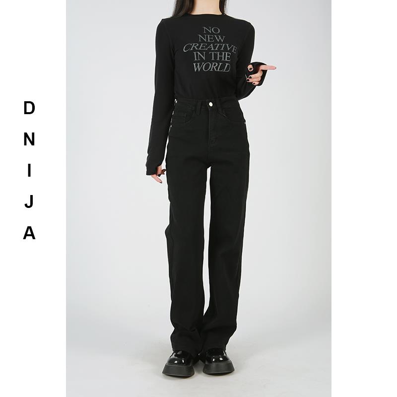 丹尼家2025热销高腰宽松直筒黑色显瘦窄版弹力牛仔长裤女韩版