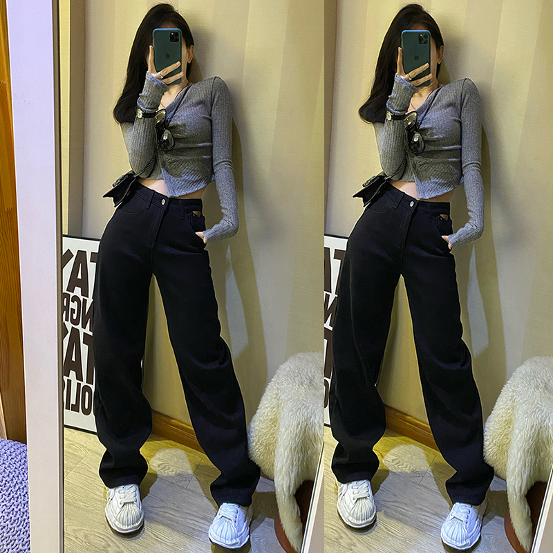 纯色百搭阔腿直筒牛仔裤女秋冬新款韩版高腰垂感黑色百搭拖地长裤