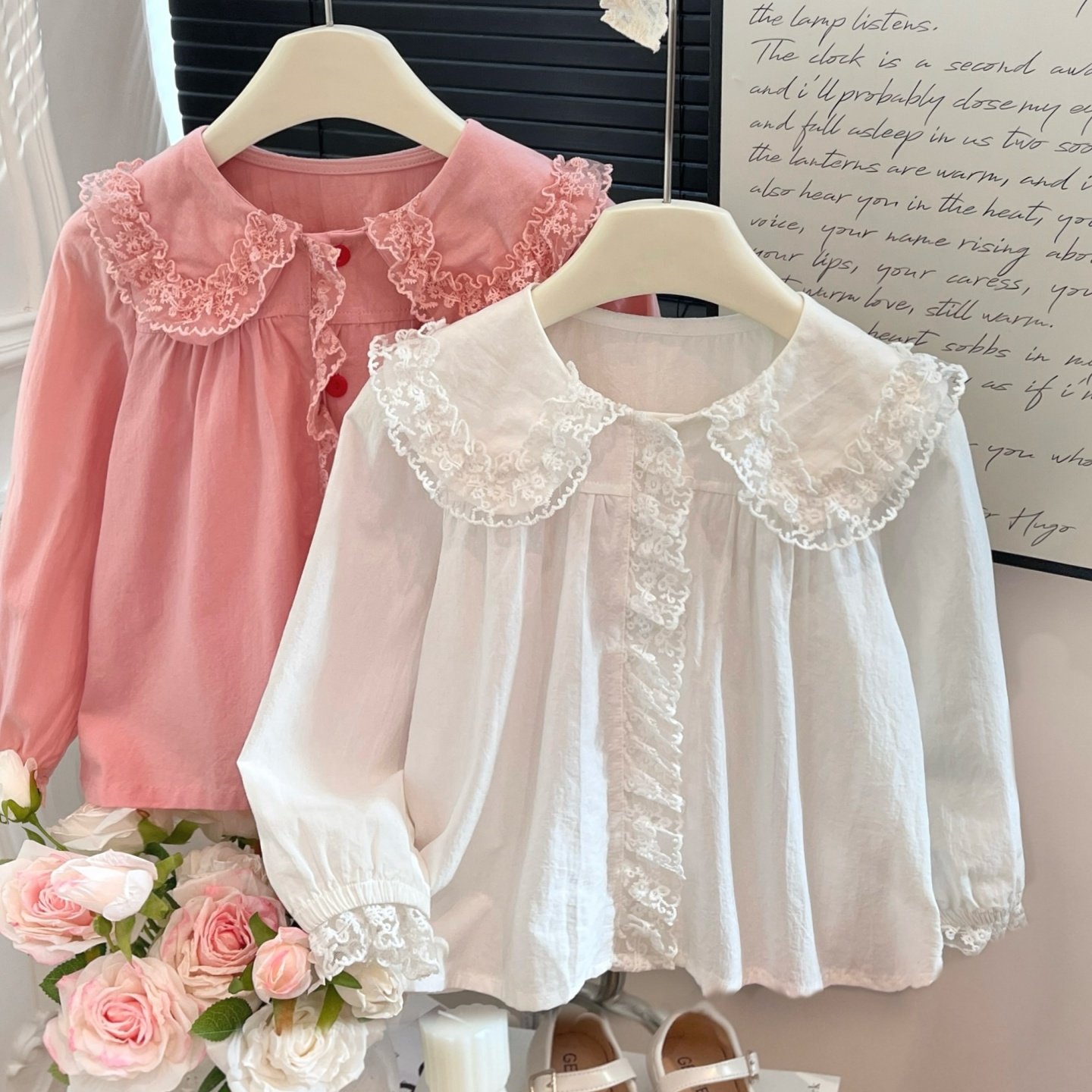 新款纯棉女童衬衣衬衫蕾丝百搭长袖娃娃领娃娃衫宝宝春秋洋气打底