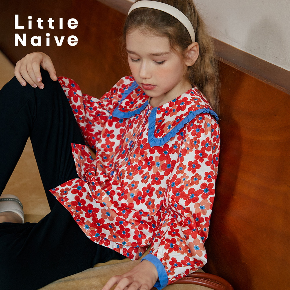 LittleNaive 春秋新款女童衬衣纯棉上衣儿童碎花长袖衬衫翻领