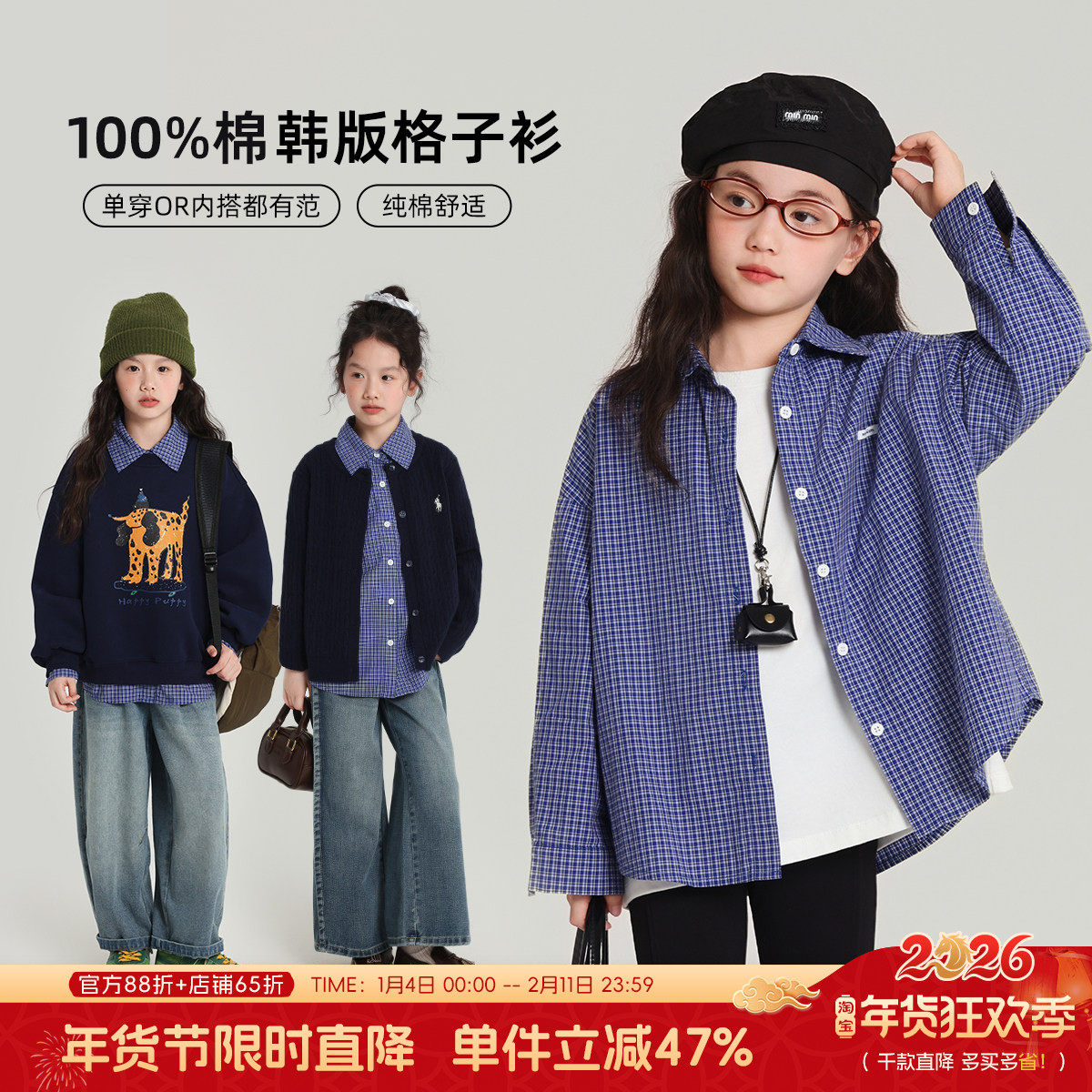 巴拉巴拉儿童格子衬衫男童女童衬衣春装2026新款童装中大童上衣潮