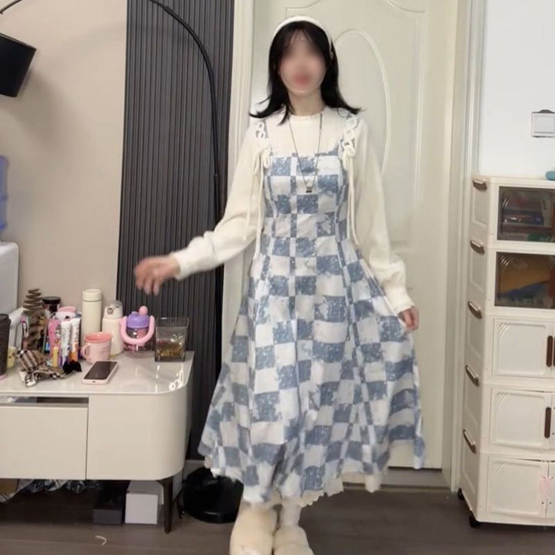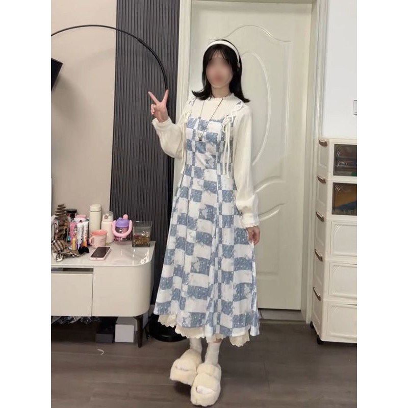 小众复古少女文艺风假两件蓝色格子拼接连衣裙甜美减龄显瘦a字裙