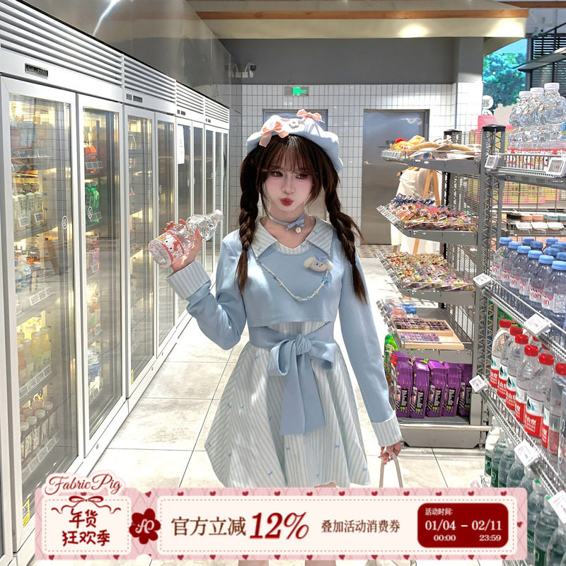 织物猪 蓝海少女 甜美风拼接假两件连衣裙女早春可爱减龄花苞短裙