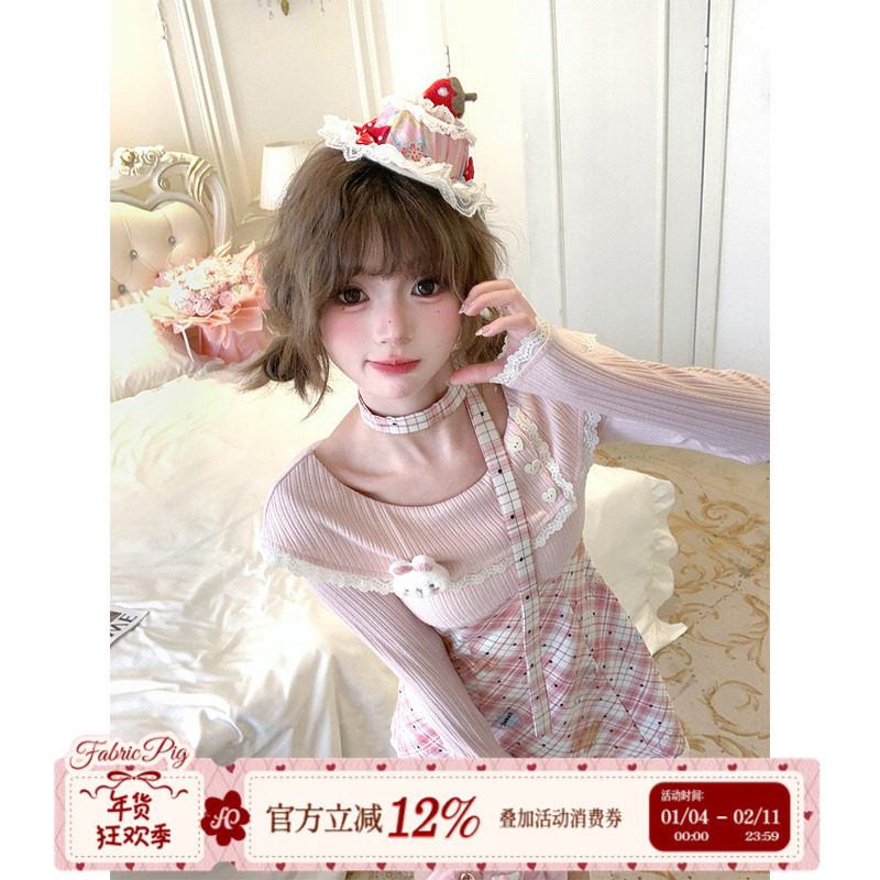 织物猪 粉莓奶糖 甜美风拼接波点连衣裙女早春针织长袖格纹短裙子