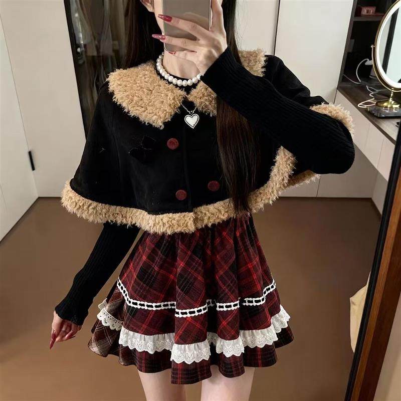 收腰显瘦圣诞套装学院斗篷外套两件格纹披肩拼接连衣裙甜美秋冬季