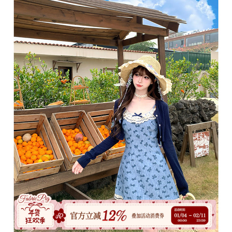 织物猪 雾蓝蝶梦 甜美风拼接吊带连衣裙女早春蝴蝶结印花短裙子