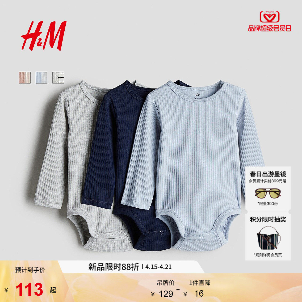 HM童装男婴连身衣3件装夏季长袖圆领罗纹哈衣爬服0993598