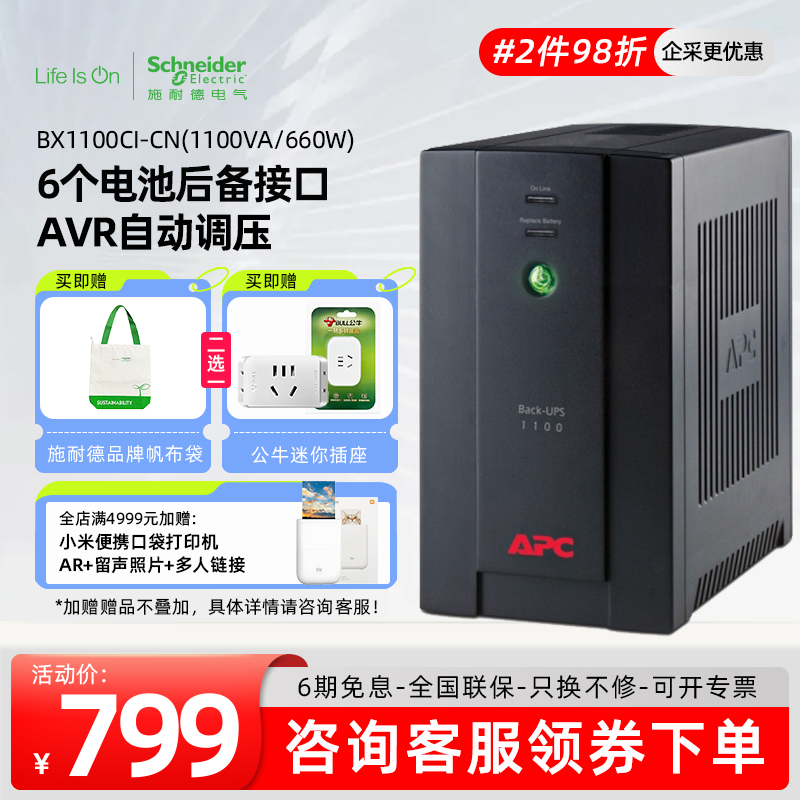 APC施耐德UPS不间断电源BX1100CI电脑路由器光猫停电备用 后备式
