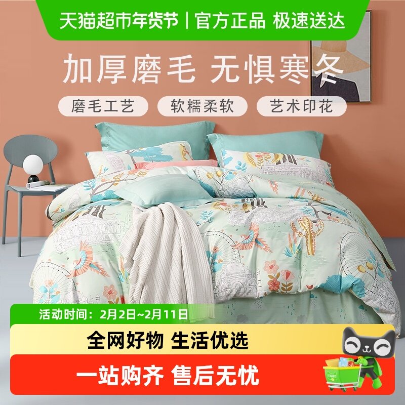 富安娜全棉磨毛四件套纯棉加厚保暖被套床单秋冬天床上用品三件套