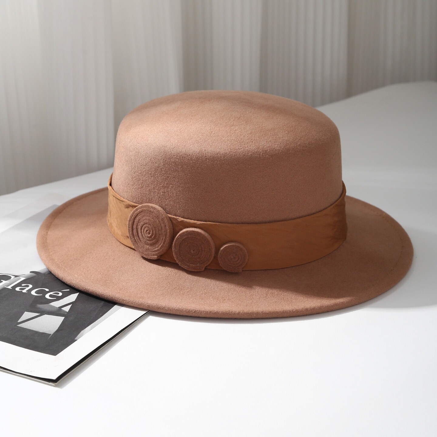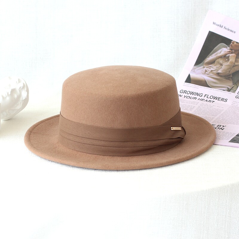 新款法式秋冬平顶羊毛呢礼帽子女平沿小沿英伦大头围百搭驼色黑色