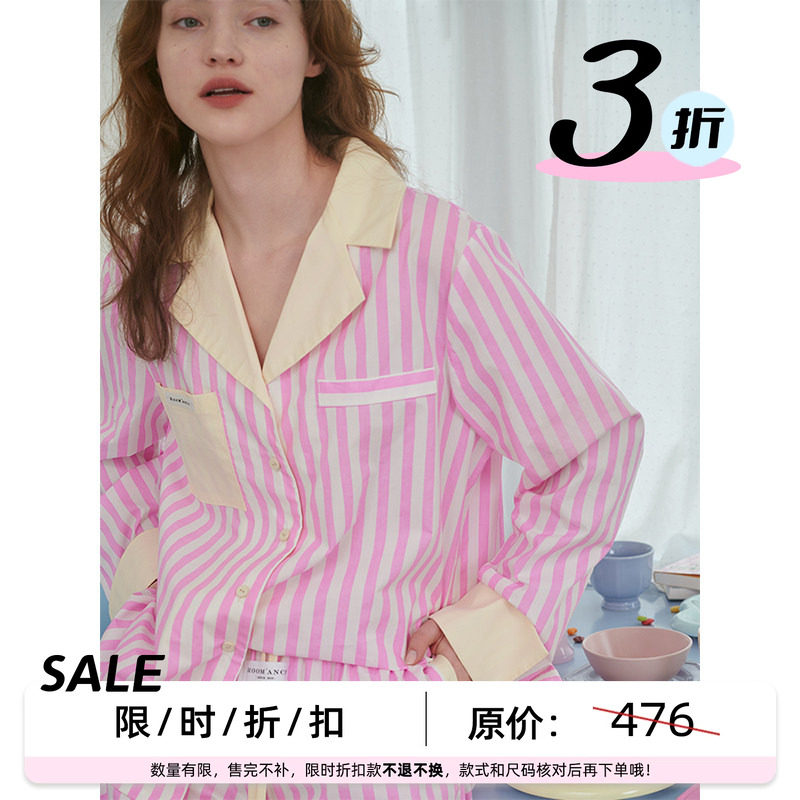 【3折】RooMance原创设计条纹撞色纯棉睡衣女款可外穿家居服套装