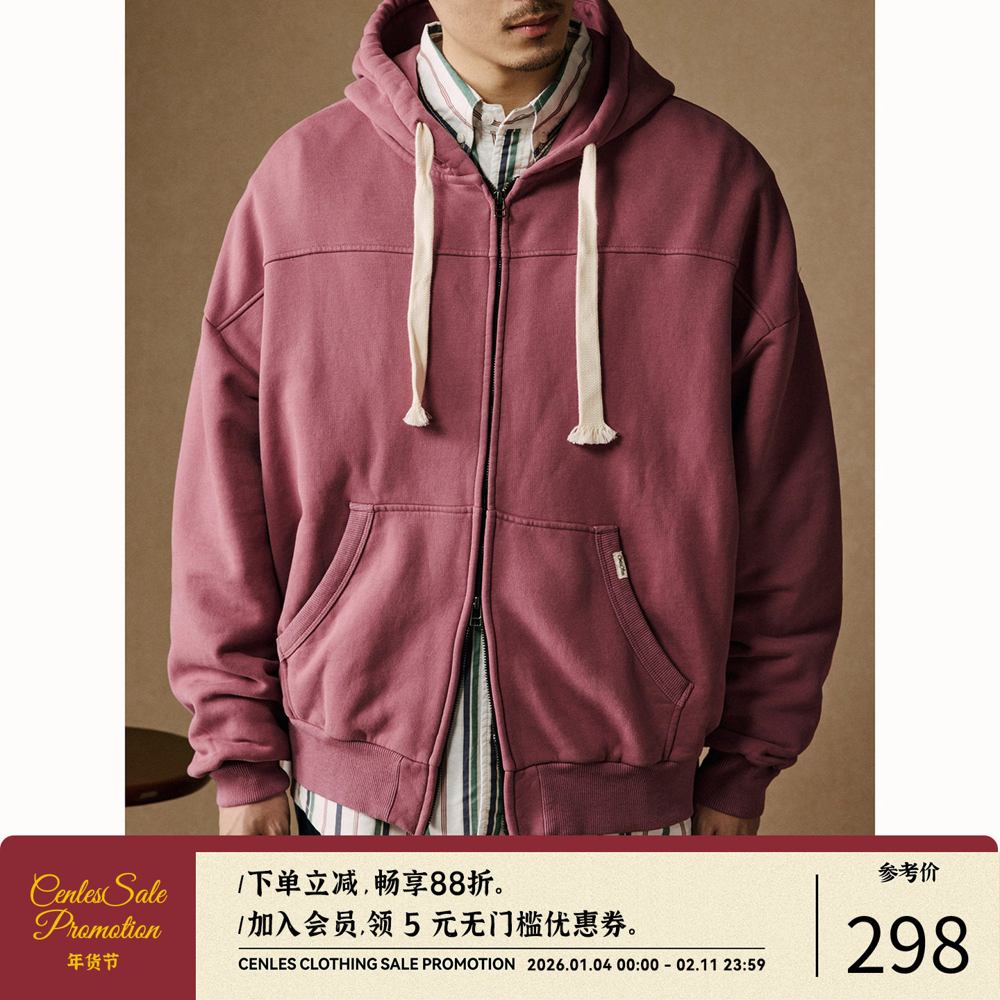 CENLES 基础短阔连帽开衫卫衣男宽松复古运动外套美式休闲