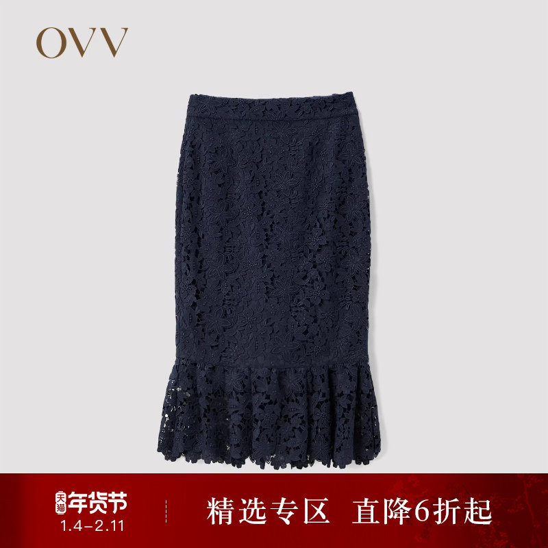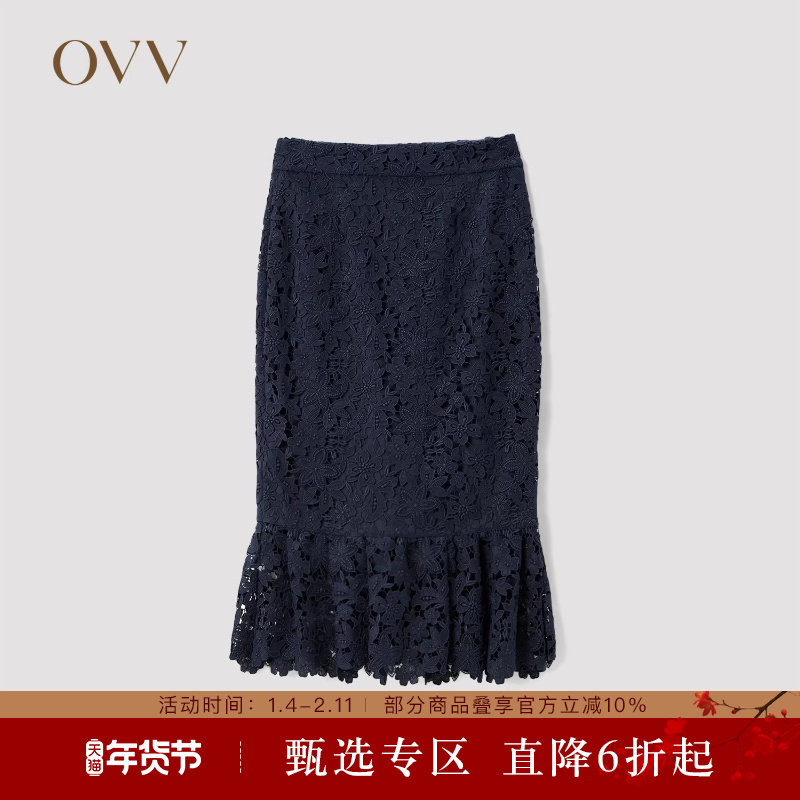 OVV Outlet秋冬女装水溶蕾丝立体修身包臀鱼尾裙半身裙