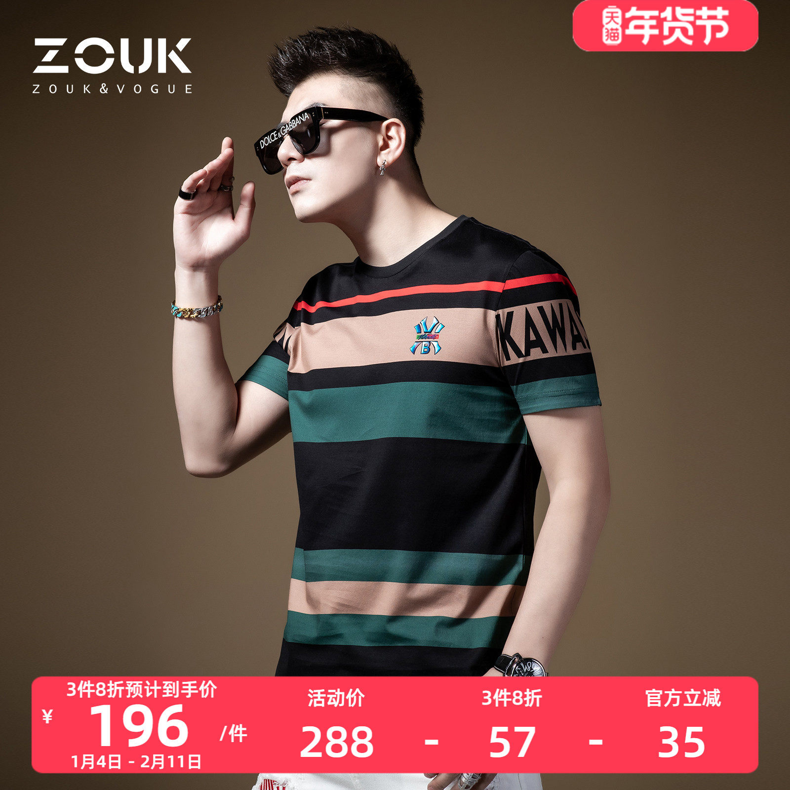 ZOUK欧洲站男装2021新款高端t恤男短袖潮牌条纹印花男士圆领半袖