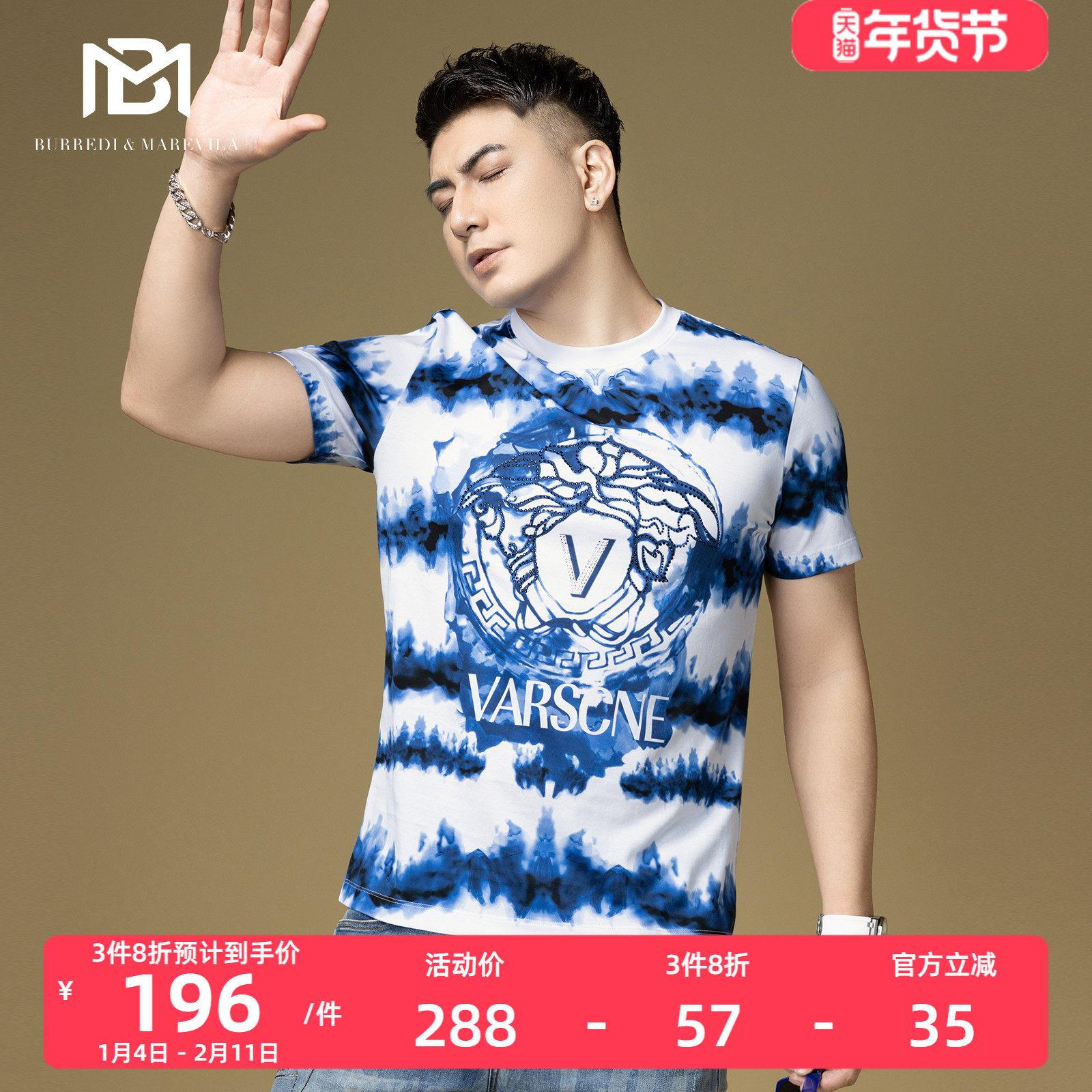 BM欧货高端t恤男扎染水波条纹烫钻潮牌纯棉短袖男装2024新款夏季