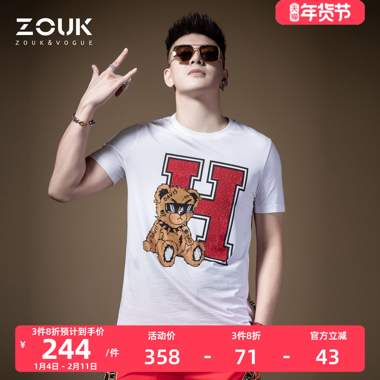 ZOUK男士短袖2021新款暴力熊印花烫钻高端t恤男潮牌百搭丝光棉夏
