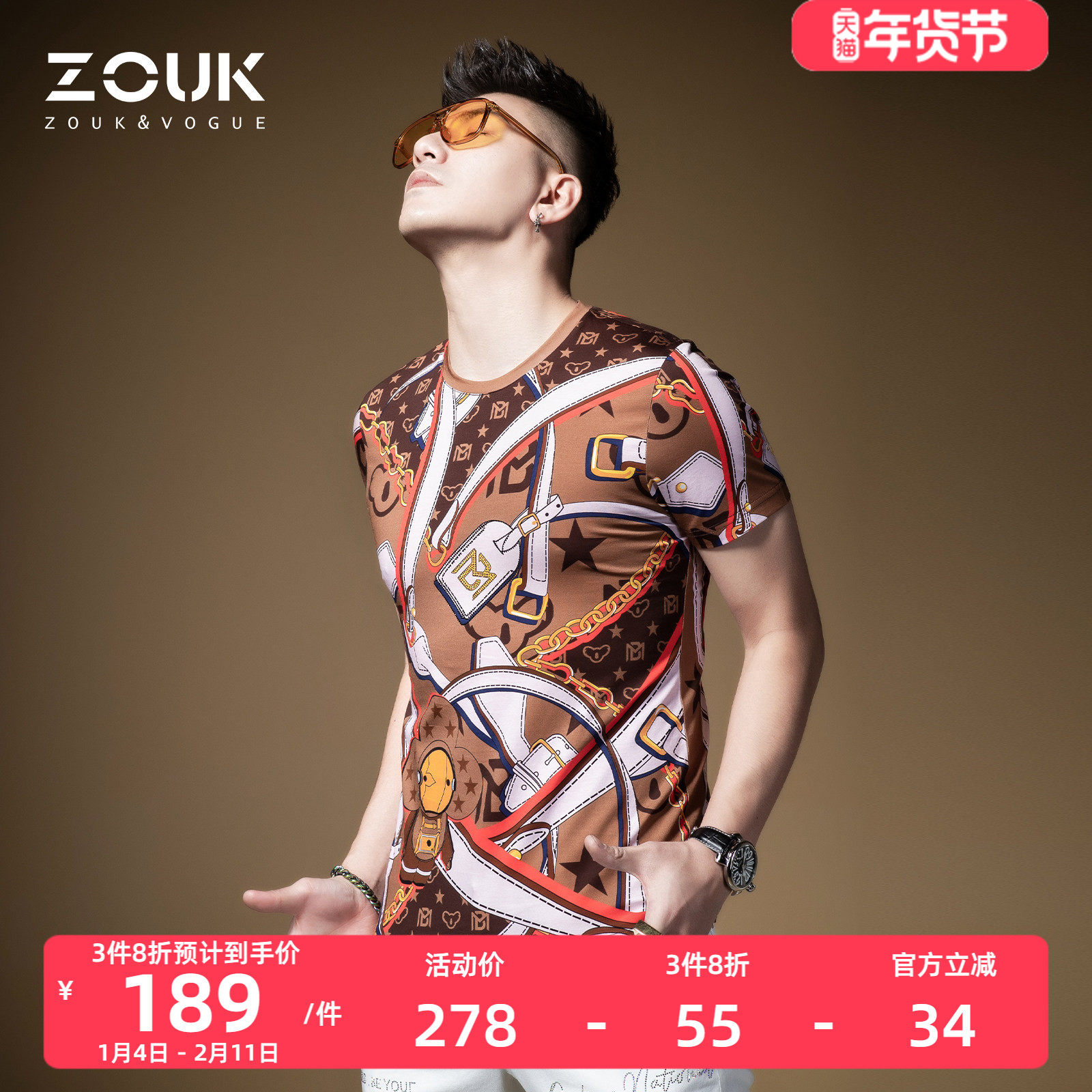 ZOUK欧洲站男装高端t恤男短袖潮牌复古巴洛克豹子印花体恤夏季