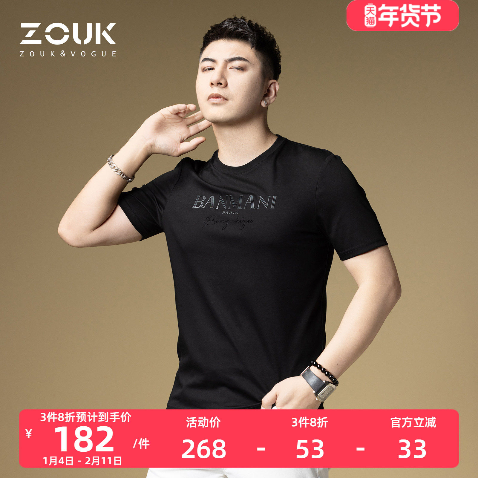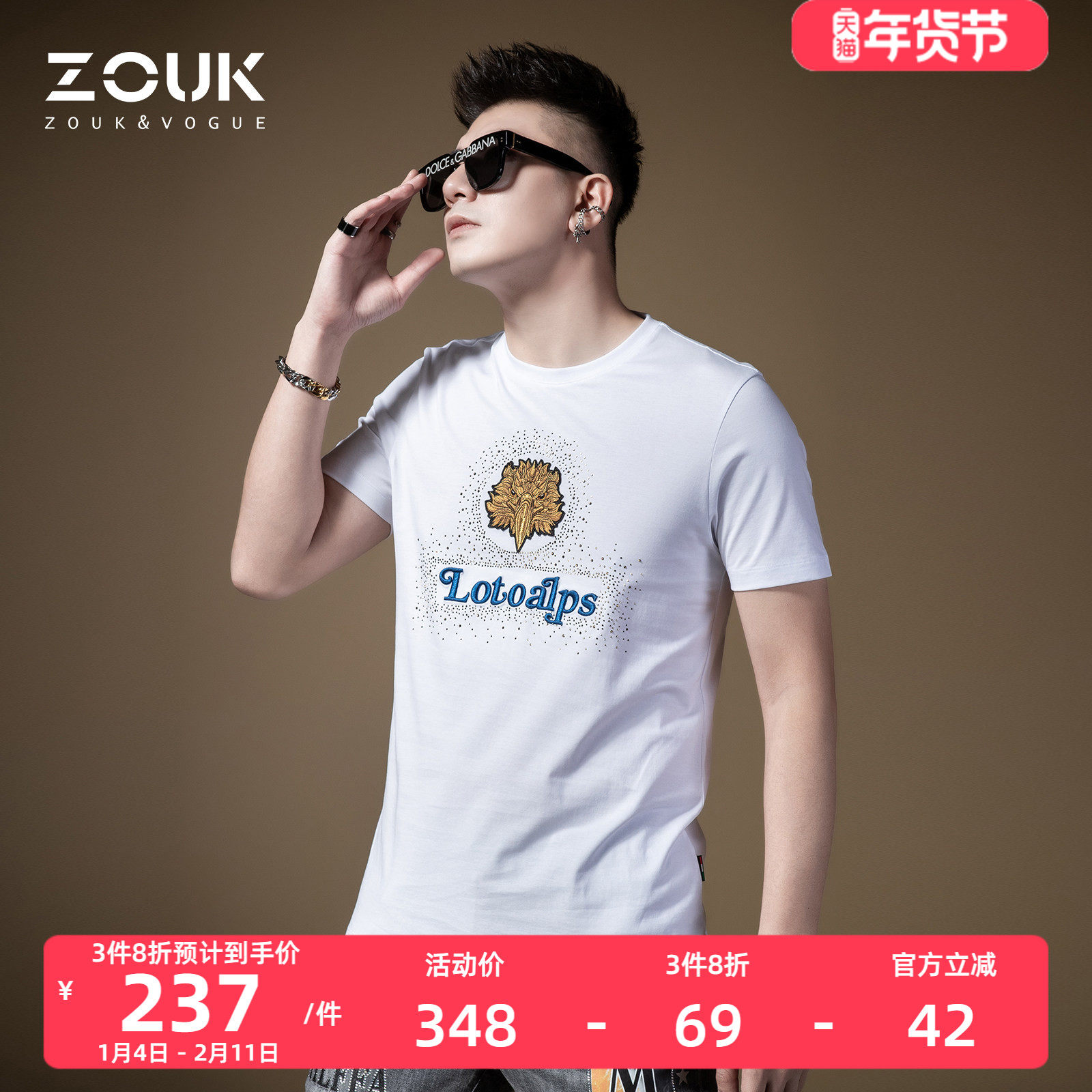 ZOUK高端t恤男烫钻字母潮牌潮流短袖2024新款男士休闲上衣修身夏
