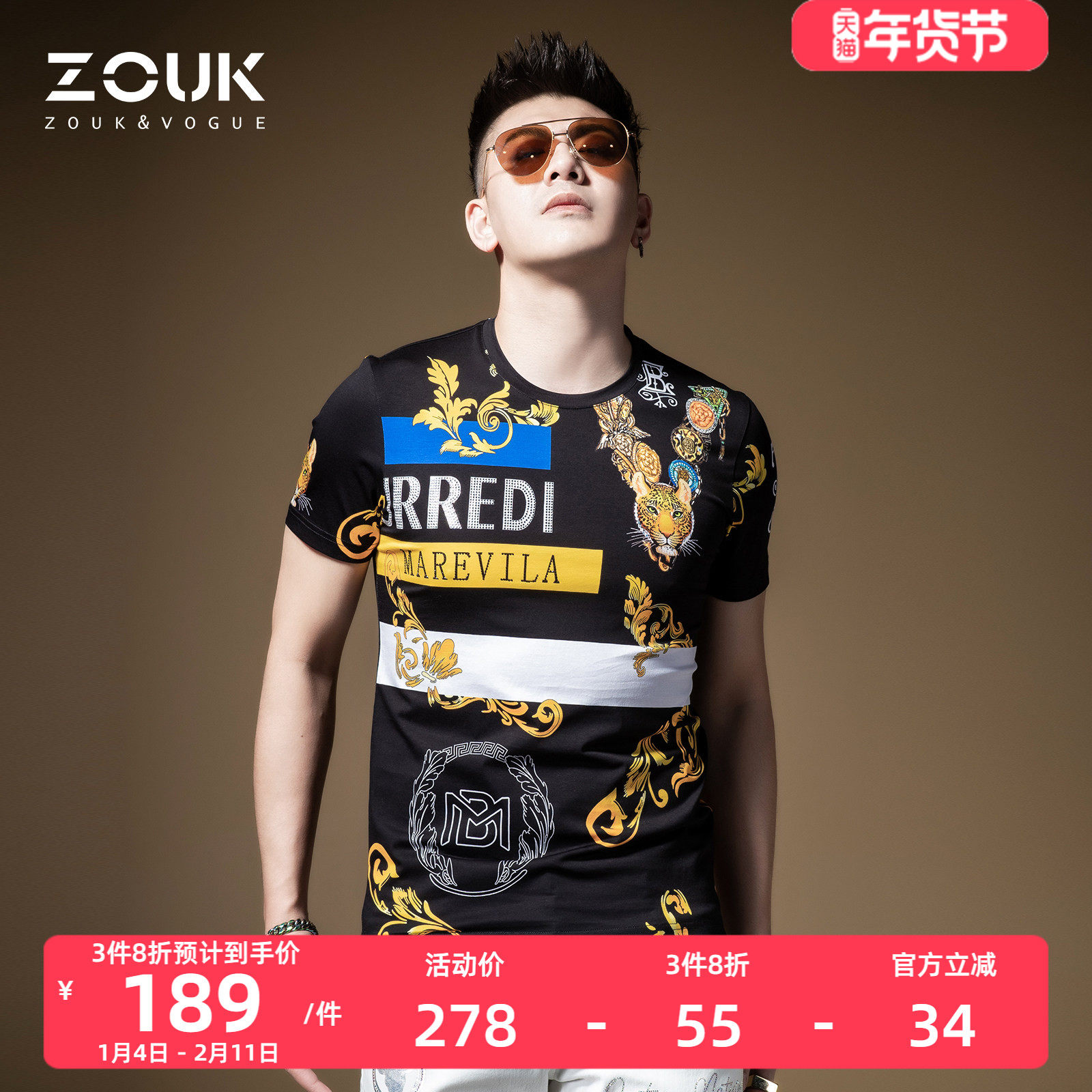 ZOUK欧货男装高端t恤男短袖潮牌太阳花人印花烫钻男士休闲上衣夏
