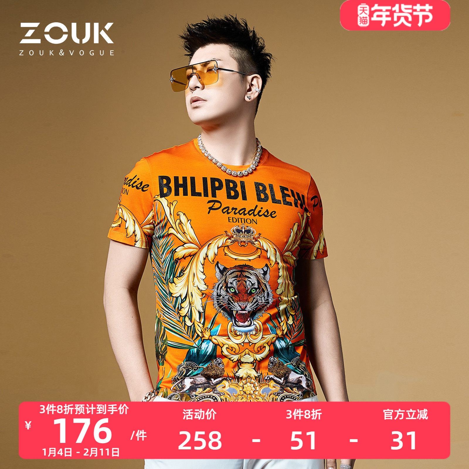 ZOUK欧货潮牌男装高端t恤男烫钻虎头印花短袖2024新款男体恤夏季