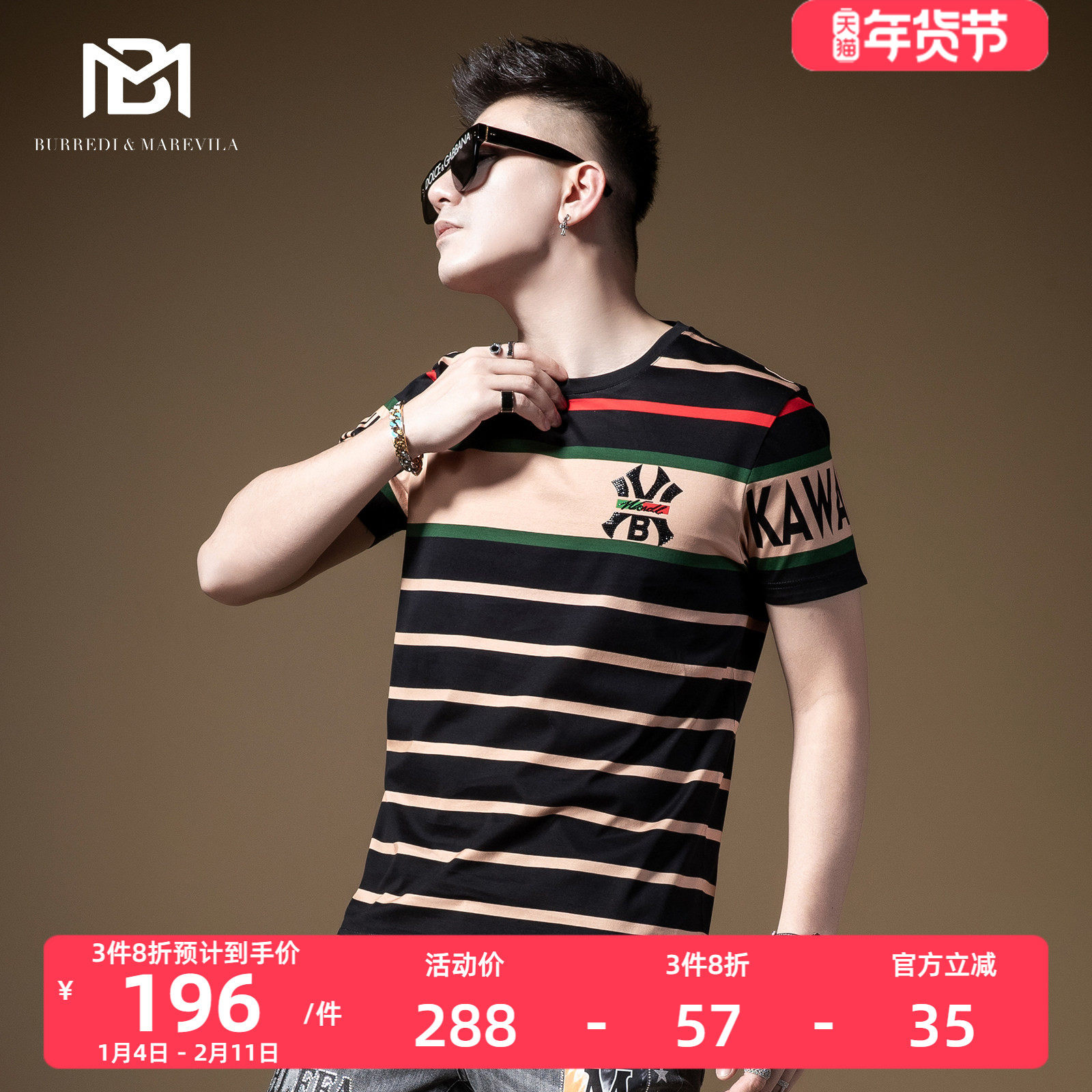 BM欧洲站男装2021新款高端t恤男短袖潮牌条纹烫钻圆领休闲上衣夏