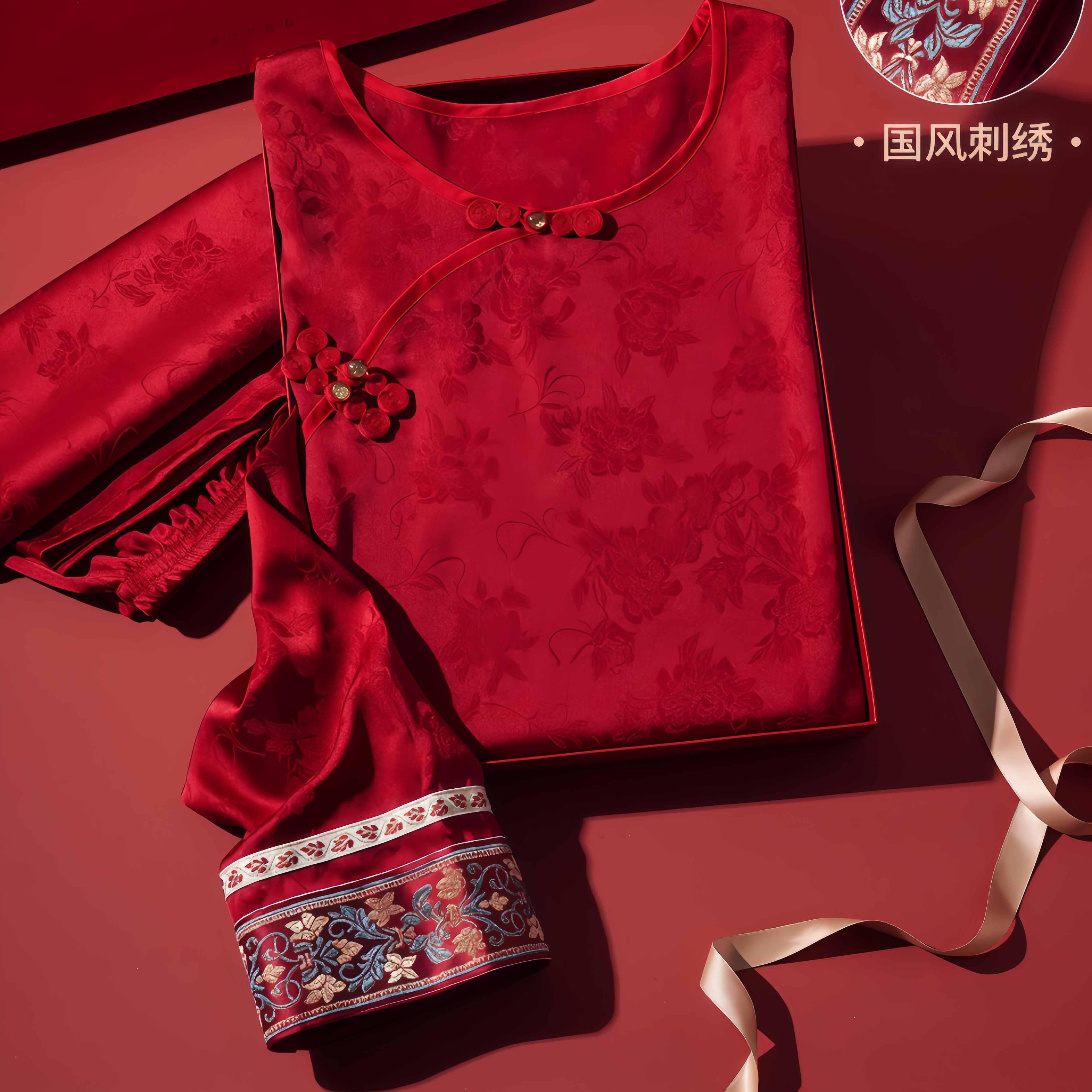 新中式红色真丝睡衣冬季长袖刺绣本命年国风圆领缎面送妈妈礼盒装