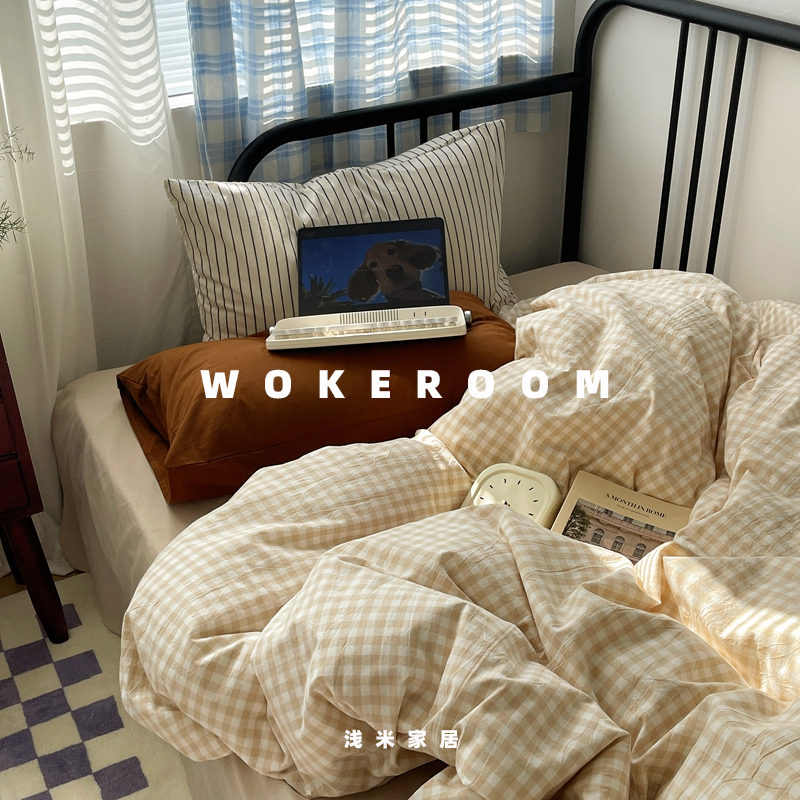 洋气格子 ins韩国博主风混搭纯棉水洗棉四件套简约米咖色双人床品