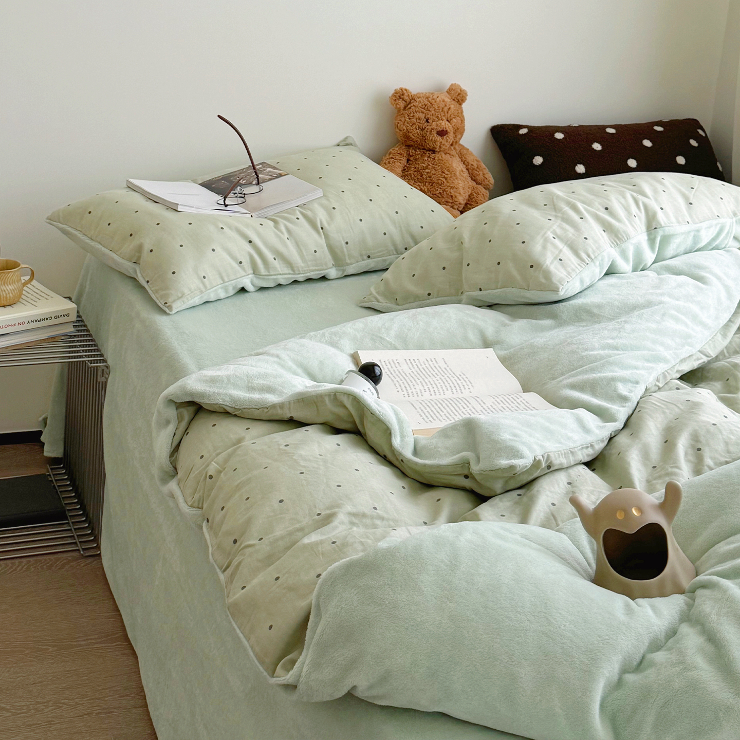 苹果奶绿|ins韩国清新波点棉加绒三四件套1.8m1.5床笠牛奶绒床单