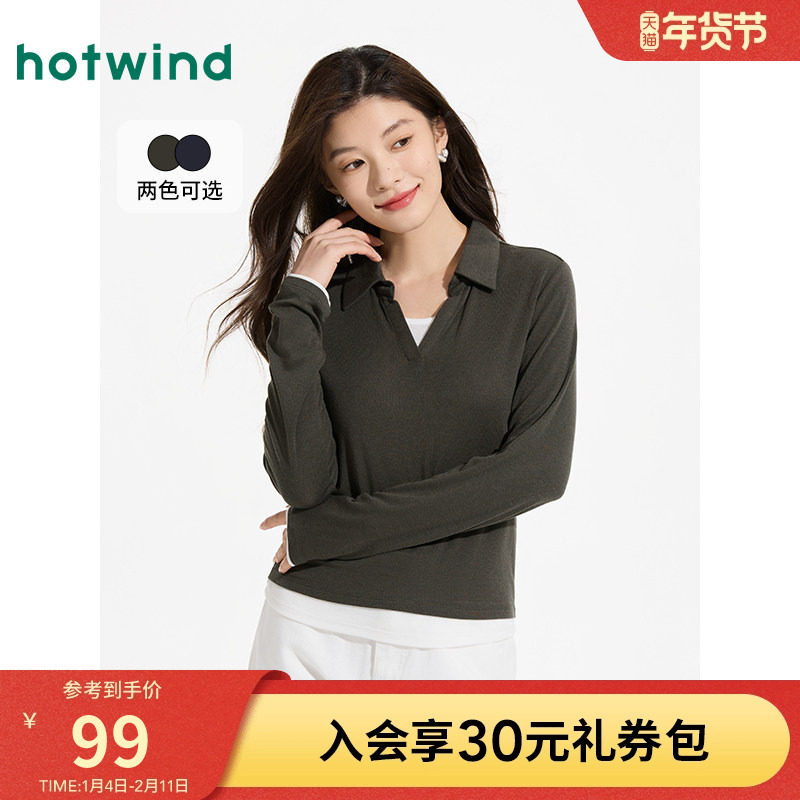 翻领打底衫热风2025年秋款女士翻领拼色长袖T恤V领假两件通勤上衣