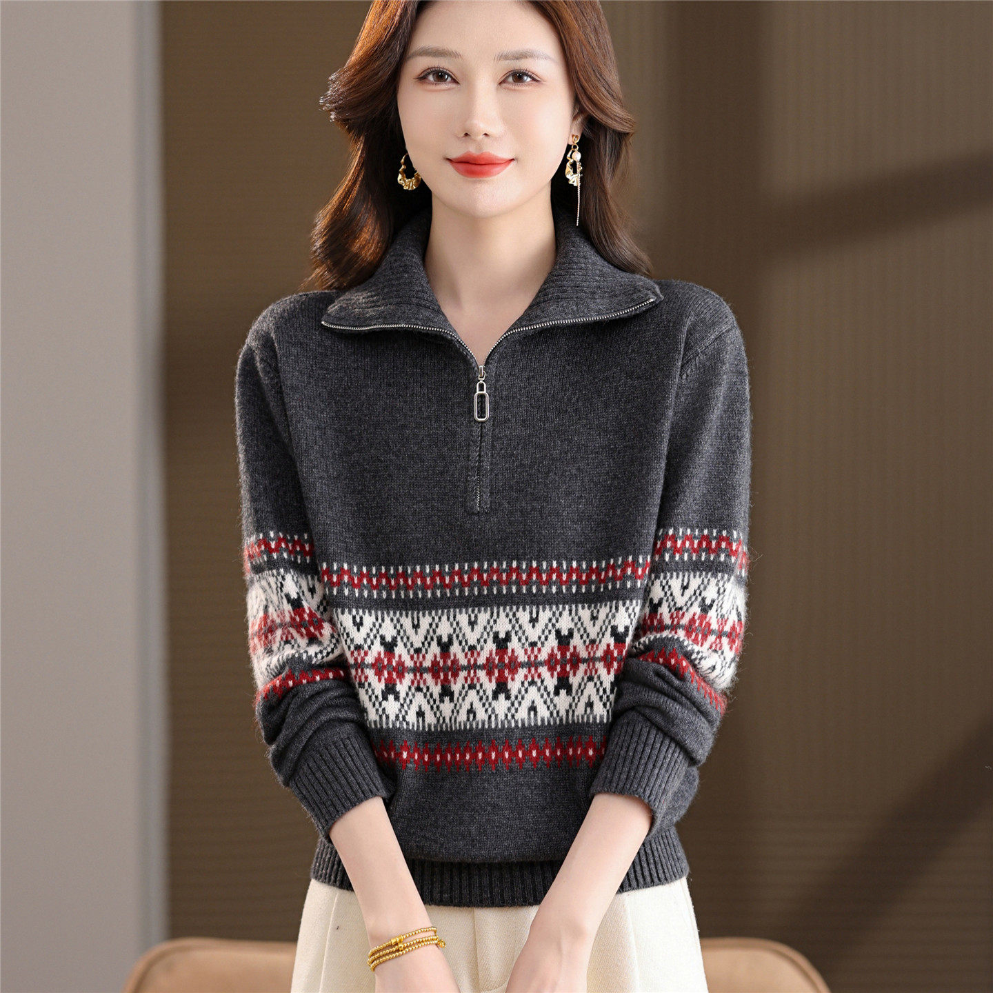 秋季时尚外穿半拉链针织羊毛衫女秋冬套头毛衣宽松显瘦翻领打底衫