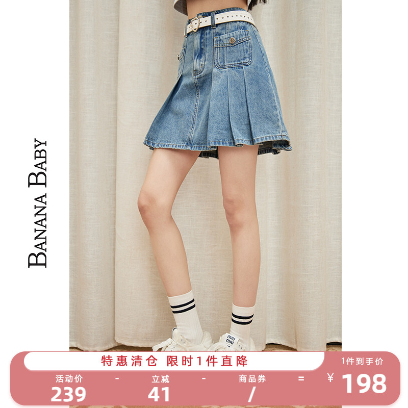 BANANA BABY2025新款百褶牛仔半身裙女复古风高腰显瘦A字短裙