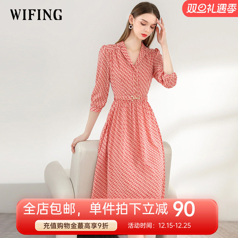 未风红色雪纺连衣裙女秋新款大码女装胖mm气质收腰裙子七分袖春秋